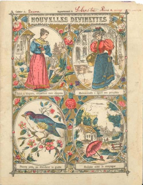 Cette importante série, dont chaque couverture présente 4 saynètes dans lesquelles il faut trouver un objet, un personnage ou un animal, est numérotée et incomplète dans la collection. C’est une des très nombreuses productions des papeteries vosgiennes de Clairefontaine. En 1858, Jean-Baptiste Bichelberger reprend un moulin à papiers (à base de chiffon) créé au 16ème siècle et le modernise. Vingt ans plus tard, son fils et son gendre, Campion, y introduisent le bois comme matière première et se lancent dans la fabrication d’enveloppes et de cahiers. De 1904 à 1914, l’entreprise (1000 employés) est dirigée par Louis Nusse et Étienne Bodet… Illustrateur inconnu