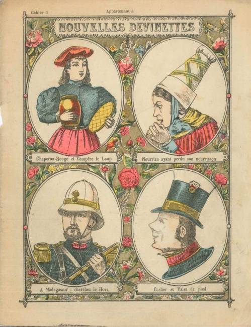 Cette importante série, dont chaque couverture présente 4 saynètes dans lesquelles il faut trouver un objet, un personnage ou un animal, est numérotée et incomplète dans la collection. C’est une des très nombreuses productions des papeteries vosgiennes de Clairefontaine. En 1858, Jean-Baptiste Bichelberger reprend un moulin à papiers (à base de chiffon) créé au 16ème siècle et le modernise. Vingt ans plus tard, son fils et son gendre, Campion, y introduisent le bois comme matière première et se lancent dans la fabrication d’enveloppes et de cahiers. De 1904 à 1914, l’entreprise (1000 employés) est dirigée par Louis Nusse et Étienne Bodet… Illustrateur inconnu.
