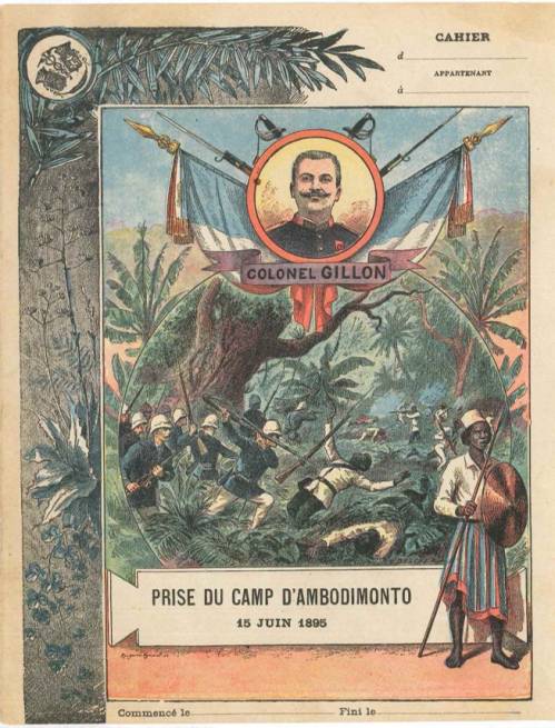 Couverture non numérotée : Colonel Gillon / Prise du camp d’Ambodimonto. Chromolithographie sur papier épais beige. Frise feuillue avec portrait en médaillon et gravure. Au dos, texte explicatif anonyme avec frise élégante bleue.