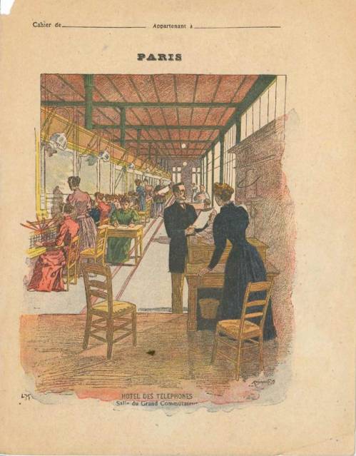 Couverture non numérotée : L’Hôtel des téléphones (la salle du grand commutateur). Chromolithographie sur papier épais beige. En pages intérieures, deux textes explicatifs anonymes : l’ancienne poste, la nouvelle poste (PTT, Postes-Télégraphes-Téléphones).Au dos, gravure en n/b sur la malle-poste.