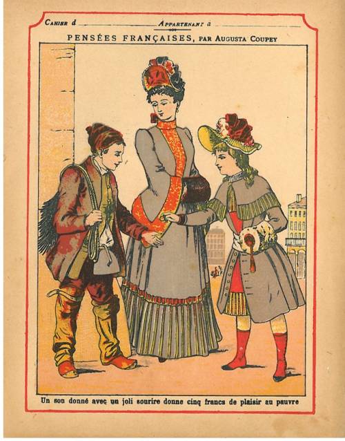 Couverture non numérotée : « Un sou donné avec un joli sourire donne cinq heures de plaisir au pauvre.» Chromolithographie sur papier beige épais. Au dos, Collection pour jeunes filles : modèles de broderies.