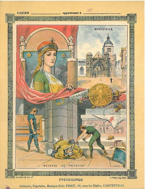 Couverture non numérotée : Frédégonde. Chromolithographie sur papier épais beige. Frise, portrait et deux gravures. Au dos, texte explicatif anonyme