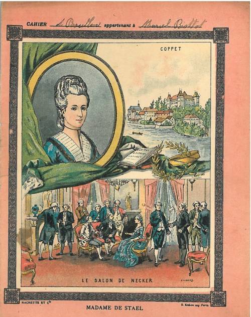 Couverture non numérotée : Madame de Staël. Chromolithographie sur papier épais beige. Frise, portrait et deux gravures… cahier de brouillon appartenant à Marcel Biottot. Au dos, texte explicatif anonyme.