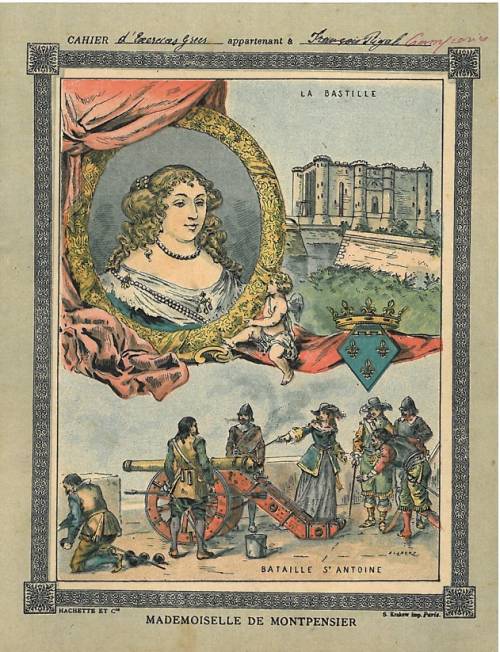 Couverture non numérotée : Mademoiselle de Montpensier. Chromolithographie sur papier épais beige. Frise, portrait et deux gravures… cahier d’exercices grecs appartenant à (illisible). Au dos, texte explicatif anonyme