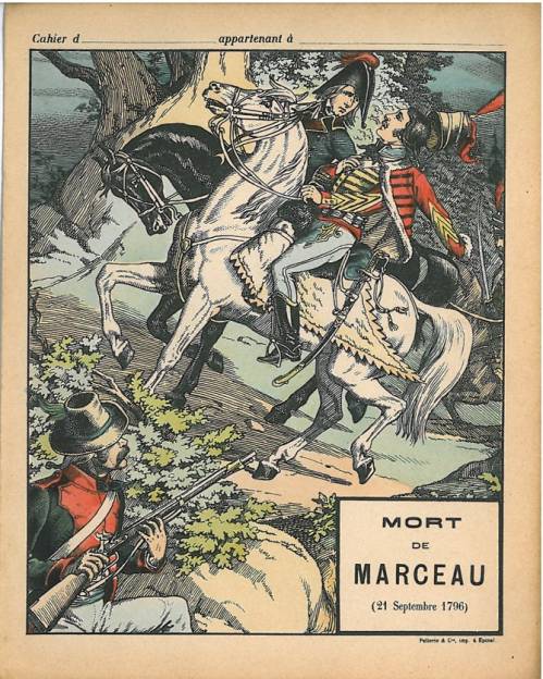 Couverture non numérotée : Mort de Marceau ; Chromolithographie sur papier épais beige, Au dos, texte explicatif anonyme, avec portrait.