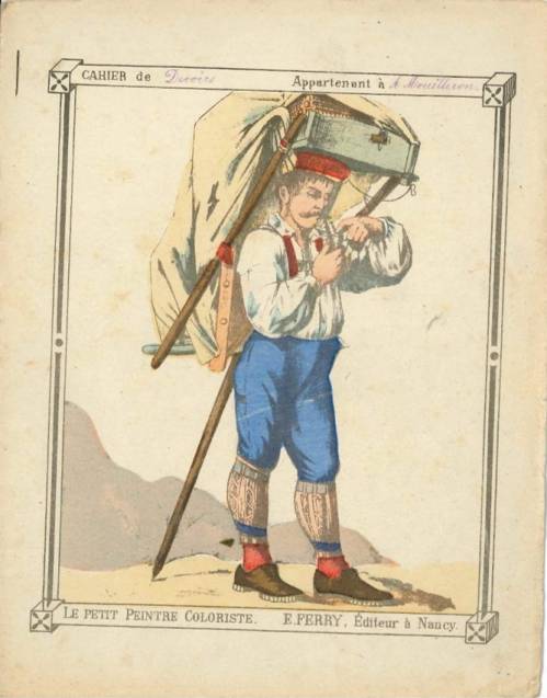 Couverture non numérotée : Porte-faix. Chromolithographie sur papier épais beige. Dessin colorisé… cahier de devoir de M. Mouilleron. Au dos, le même dessin à colorier : « Joli dessin à colorier suivant le modèle ci-contre ».
