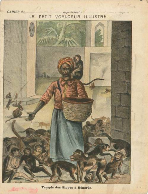 Couverture non numérotée : Temples des singes à Bénarès. Chromolithographie sur papier épais beige. Au dos, texte explicatif anonyme.