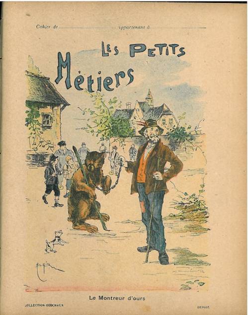 Couverture non numérotée : Le montreur d’ours. Chromolithographie sur papier épais beige… cahier appartenant à Marie Coussouy. Au dos, texte explicatif anonyme.