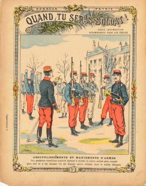 Couverture n°3 : Assouplissement et maniement d’armes. Chromolithographie sur papier épais beige, avec frise colorée et florale.. Au dos, texte explicatif anonyme, avec lettrine illustrée.