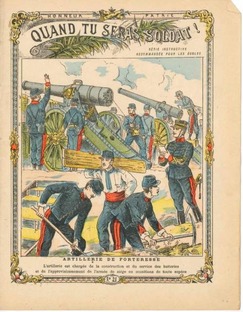 Couverture n°22 : Artillerie de forteresse. Artillerie de forteresse. Chromolithographie sur papier épais beige, avec frise colorée et florale. Au dos, texte explicatif anonyme, avec gravure n/b (soldat). )