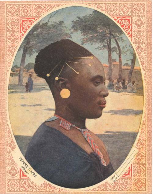 Couverture n°7 : Femme cafre (Afrique). Chromolithographie sur papier épais beige. Gravure-portrait dans un ovale, sur élégant fond rose. Au dos, texte explicatif anonyme.