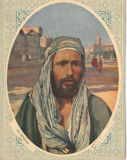 Couverture n°6 : Un Bédouin. Chromolithographie sur papier épais beige. Gravure-portrait dans un ovale, sur élégant fond bleu. Au dos, texte explicatif anonyme. Au dos, texte explicatif anonyme.
