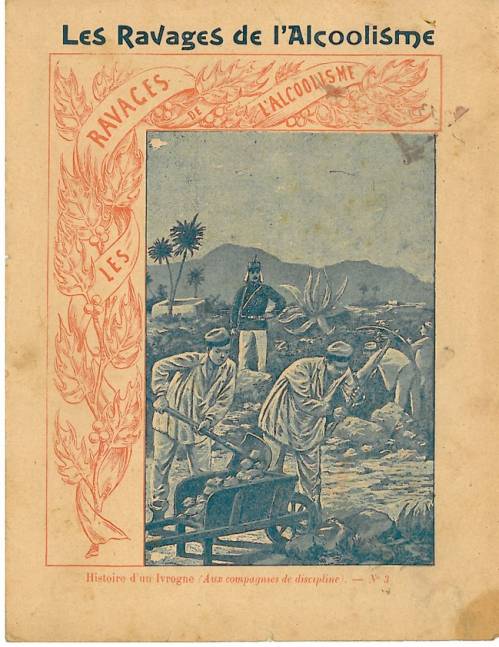 Couverture n° 3 : Histoire d’un ivrogne (aux campagnes de discipline). Chromolithographie sur papier épais beige, avec frise florale. Bichromie. Au dos, texte explicatif signé Er. Richa, l’anagramme de l’éditeur +extraits des Tableaux antialcooliques de M. Legendre.