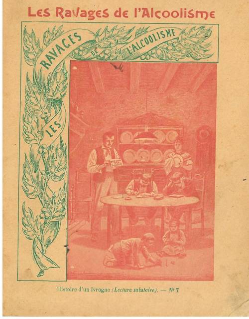 Couverture n° 7 : Histoire d’un ivrogne (lecture salutaire). Chromolithographie sur papier épais beige, avec frise florale. Bichromie. Au dos, texte explicatif signé Er. Richa, l’anagramme de l’éditeur + texte sur les remèdes contre l’alcoolisme.