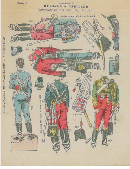 Couverture non numérotée : Hussard. Chromolithographie sur papier épais beige. Au dos, suite de la saynète à découper.