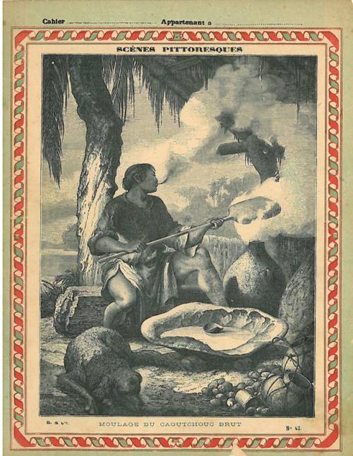 Couverture n°42 : Moule du caoutchouc brut. Chromolithographie sur papier beige épais. Bichromie, fond vert et frise avec entrelacs. Au dos, texte explicatif anonyme.