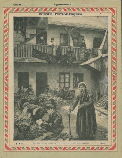 Couverture n°44 : Chez les chiffonniers. Chromolithographie sur papier beige épais. Bichromie, fond vert et frise avec entrelacs. Au dos, texte explicatif anonyme.