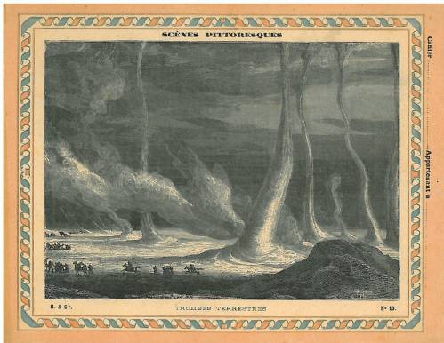 Couverture n°10 : Trombes terrestres. Chromolithographie sur papier beige épais ; Bichromie, fond rose et frise avec entrelacs. Au dos, texte explicatif anonyme.