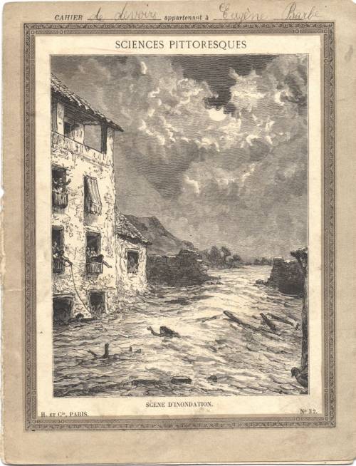 Couverture n° 32 : Inondation. Chromolithographie sur papier épais. Bichromie… cahier de devoir d’Eugène Barbe. Au dos, texte explicatif anonyme.