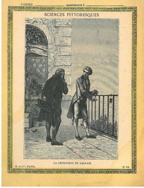 Couverture n° 33 : La grenouille de Galvani. Chromolithographie sur papier épais. Bichromie. Au dos, texte explicatif anonyme.