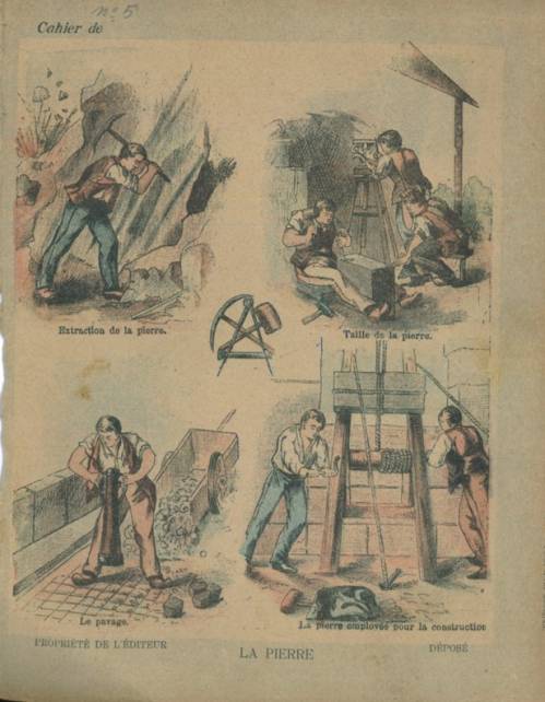 Couverture non numérotée : La pierre (extraction, taille, pavage, construction). Chromolithographie sur papier épais. Au dos, texte explicatif anonyme.