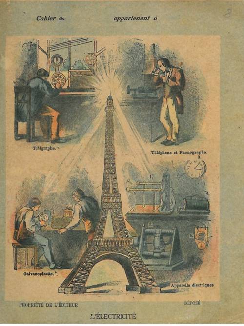 Couverture non numérotée : Télégraphie, téléphone, galvanoplastie, appareils électriques. Chromolithographie sur papier épais. Au dos, texte explicatif anonyme..