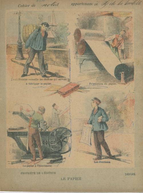 Couverture non numérotée : Papier (chiffons, fabrication, imprimerie, journaux). Chromolithographie sur papier épais. Au dos, texte explicatif anonyme.