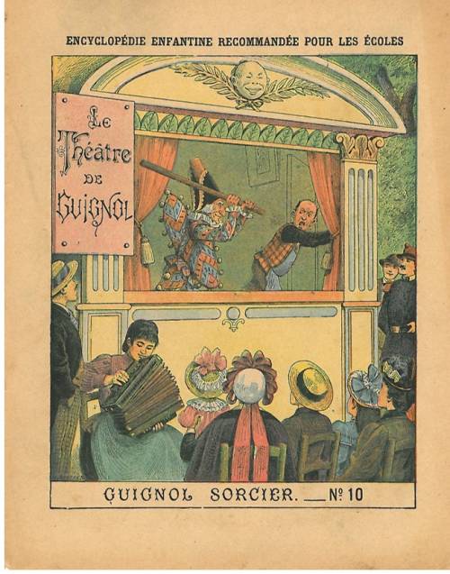 Couverture n°19 : Guignol sorcier. Chromolithographie sur papier épais beige. Au dos, texte d’une pièce en un acte du théâtre de Guignol. Signature Er. Richa, anagramme de l’éditeur.