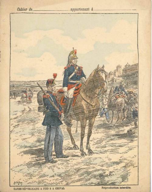 Couverture non numérotée : Garde républicaine à cheval et à pied. Chromolithographie sur papier épais beige. Au dos, texte explicatif anonyme.