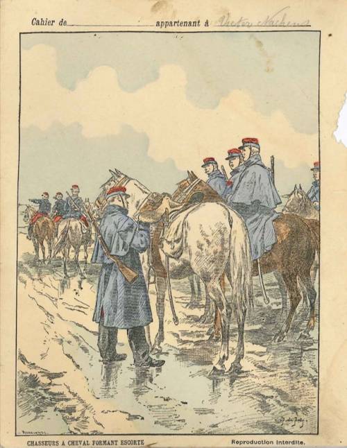 Couverture non numérotée : Chasseurs à cheval. Chromolithographie sur papier épais beige… cahier appartenant à Victor Nackens. Au dos, texte explicatif anonyme.