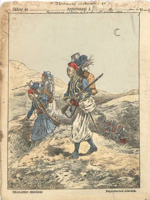 Couverture non numérotée : Tirailleurs indigènes. Chromolithographie sur papier épais beige… cahier scolaire appartenant à .Noémie (illisible), première entrée à l’école le 1er octobre 1898. Au dos, texte explicatif anonyme.