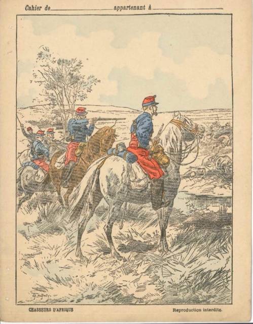 Couverture non numérotée : Chasseurs ‘Afrique. Chromolithographie sur papier épais beige. Au dos, texte explicatif anonyme.