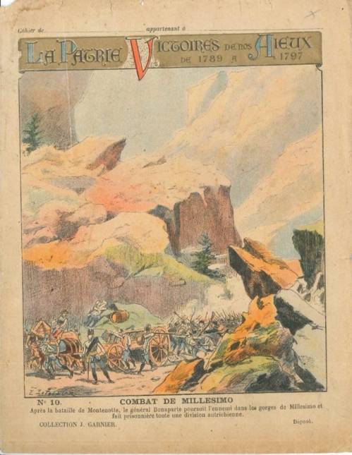 Couverture n°10 : Combat de Millésimo (gravure légendée). Chromolithographie sur papier épais beige. Au dos, texte explicatif signé Louis Chrétien.