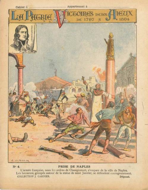 Couverture n° 4: Prise de Naples (gravure légendée) en 1798, avec portrait de Championnet. Chromolithographie sur papier épais beige. Au dos, texte explicatif signé Louis Chrétien.