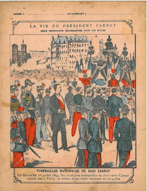 Couverture n°7 : Funérailles nationales de Sadi Carnot. Chromolithographie sur papier beige épais. Frise et gravure légendée. Au dos, texte explicatif anonyme.