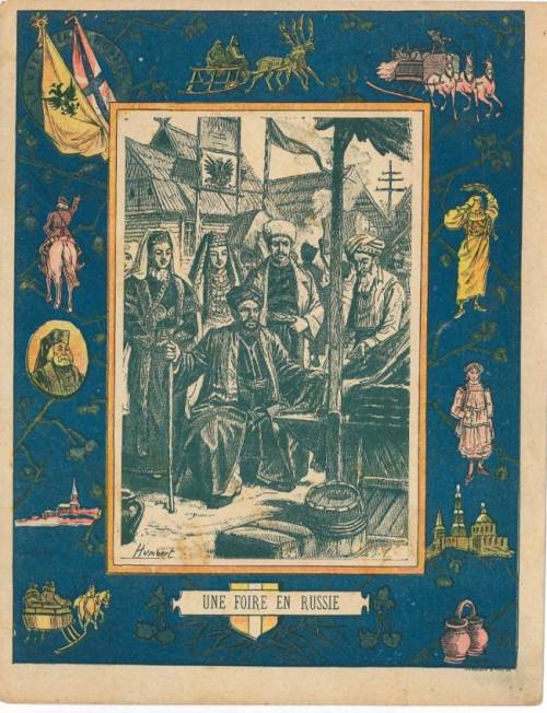 Couverture non numérotée : Foire en Russie. Chromolithographie sur papier épais beige. Gravure en monochromie dans large encadrement bleu avec drapeau, personnages, saynètes. Au dos, frise en monochromie ace saynètes annonçant les sujets de la série. Texte signé Er. Richa, anagramme de l’éditeur Charier.