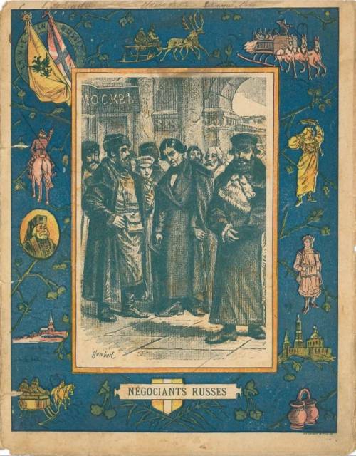 Couverture non numérotée : Négociants russe.Chromolithographie sur papier épais beige. Gravure en monochromie dans large encadrement bleu avec drapeau, personnages, saynètes. Au dos, frise en monochromie ace saynètes annonçant les sujets de la série. Texte signé Er. Richa, anagramme de l’éditeur Charier.