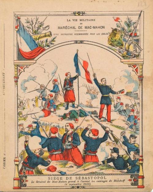 Couverture n° 3 : Siège de Sébastopol (6 septembre 1855). Chromolithographie sur papier épais beige. Au dos, texte explicatif anonyme.