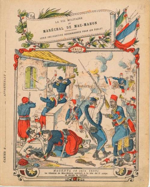 Couverture n° 4 : Magenta (4 juin 1759). Chromolithographie sur papier épais beige… cahier appartenant à François-Désiré (illisible). Au dos, texte explicatif anonyme.