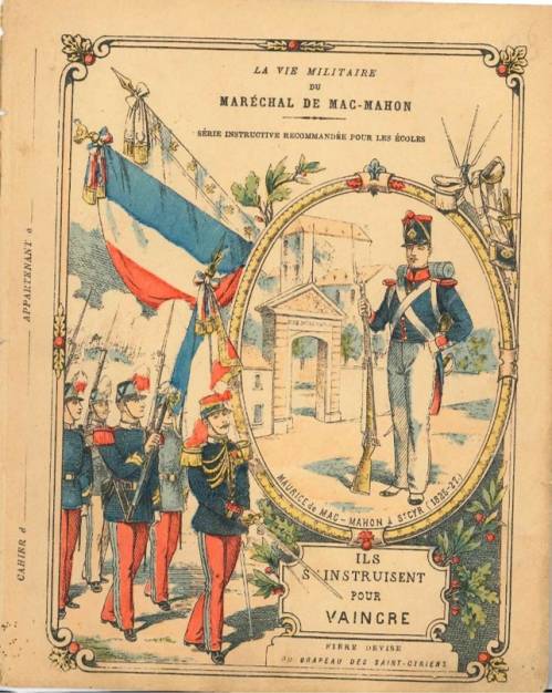 Cette série de 8 couvertures, numérotée et complète dans la collection, production de l’imagerie Vagné à Pont-à-Mousson, retrace la vie de militaire de Mac-Mahon, avant qu’il ne soitt président de la République, de 1873 à 1879. En première de couv, huit jolies frises différentes et patriotiques (bleu-blanc-rouge). Illustrateur inconnu.