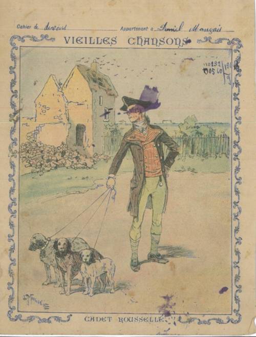 Couverture non numérotée : Cadet Rousselle. Chromolithographie sur papier épais beige… cahier de devoir appartenant à Daniel Mançais. Au dos, paroles et premières portées.