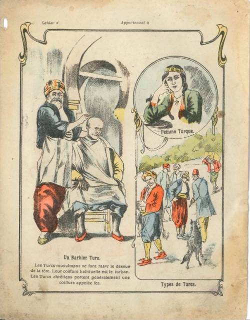 Couverture non numérotée : Un barbier turc / Femme turc/ Types turcs. Chromolithographie sur papier épais beige. Au dos, texte explicatif anonyme.