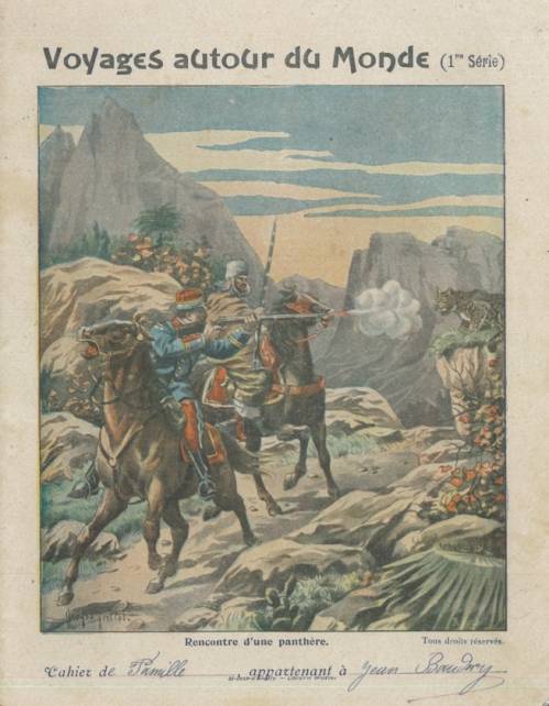 Couverture non numérotée (1ère série) : Rencontre d’une panthère. Chromolithographie sur papier épais beige… cahier de famille appartenant à Jean Baudry. Au dos, texte explicatif signé H. Carrie.