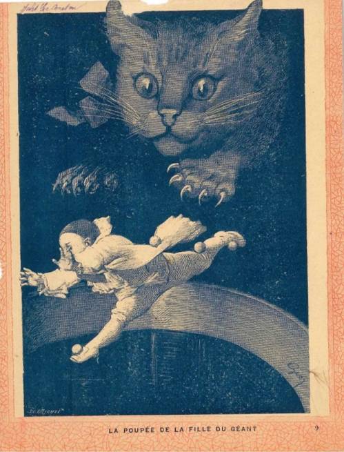 Couverture n°9 : La poupée de la fille du géant. Chromolithographie sur papier épais beige. Au dos, extrait de l’œuvre de Swift (1721).
