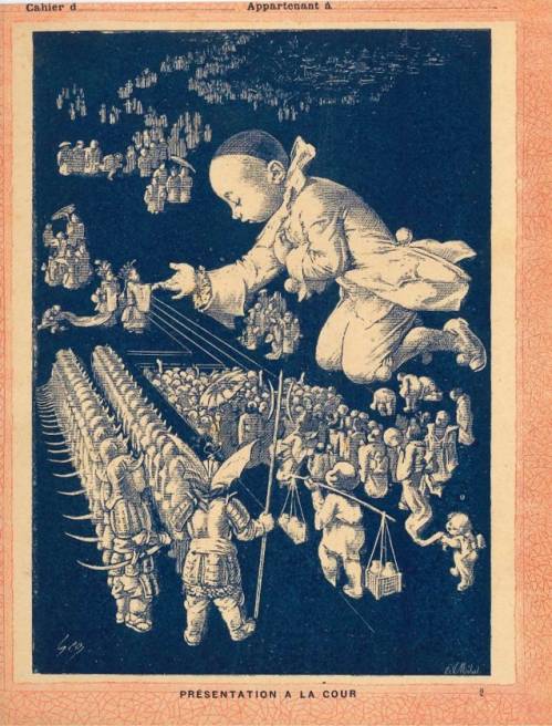 Couverture n°2 : Présentation de Gulliver à la cour. Chromolithographie sur papier épais beige. Au dos, extrait de l’œuvre de Swift (1721).
