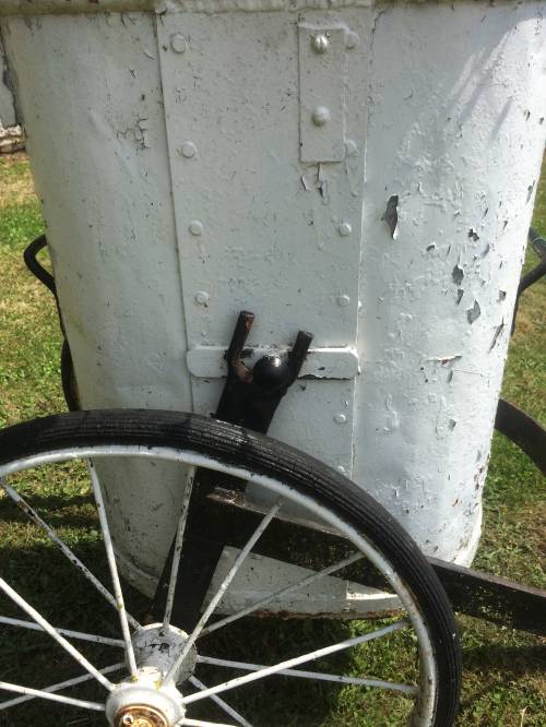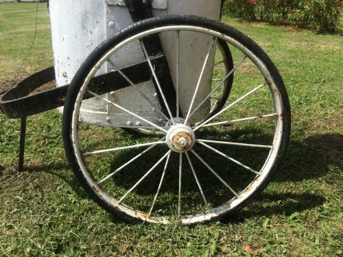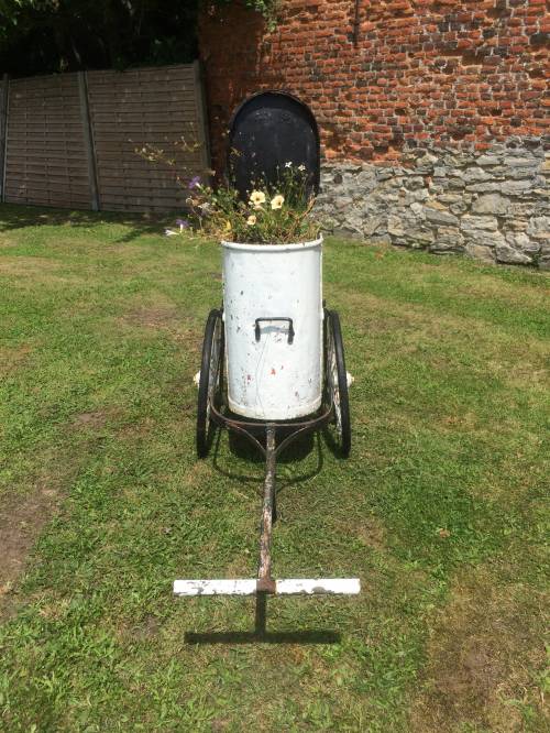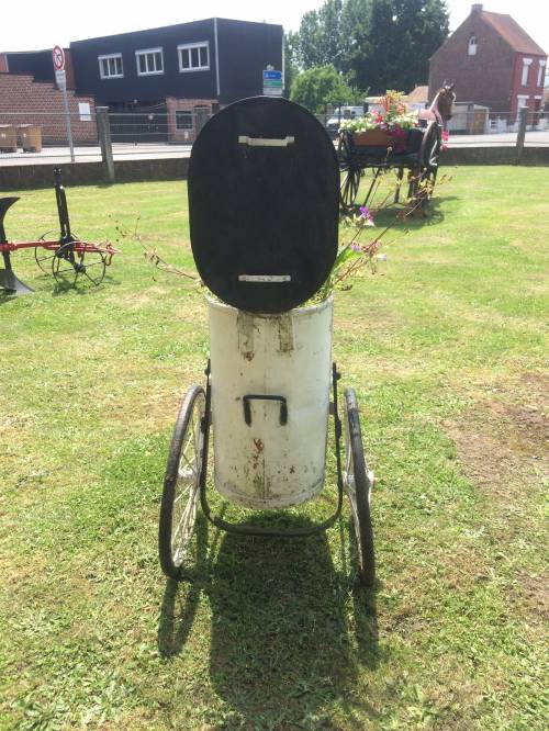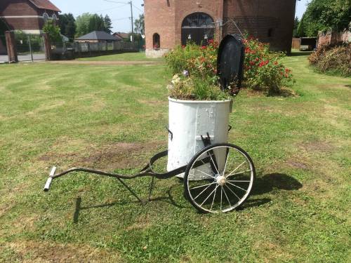 Cet objet est probablement au vu de sa forme une ancienne poubelle de jardin sur roue. Elle est facilement transportable grâce à ses roues et son manche, qui ne repose jamais complètement au sol, ce qui permet au jardinier de ne pas se baisser complétement pour le prendre.