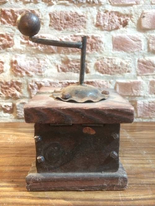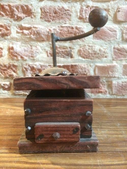 Cette boite ressemble, avec sa forme, à un moulin à café, notamment avec le tiroir et la manivelle en métal placée au dessus de l'objet. Mais cet objet ne semble qu'être une boite basique, puisque le tiroir ainsi que la manivelle ne sont pas fonctionnels mais semblent plutôt être présents pour la décoration.