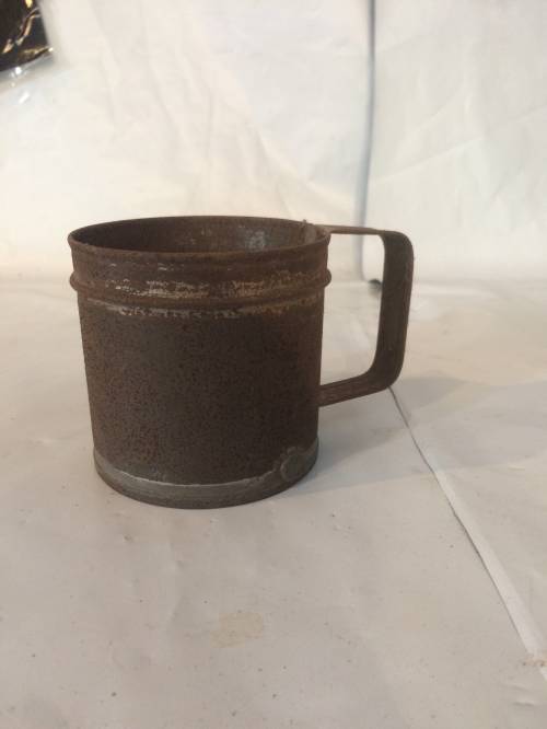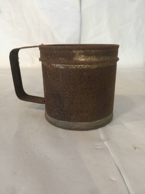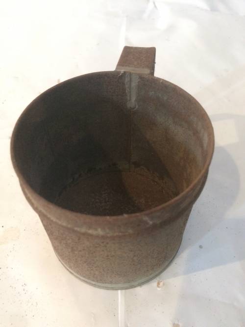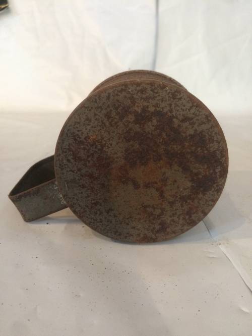 Ces petites mesures à lait, qui pouvaient avoir différentes formes, servaient au transfert du lait du bidon, à la biche, lorsque le paysan venait chercher du lait. Généralement réalisée en fer blanc ou en aluminium, la contenance était toujours indiquée par une inscription sur l'objet (dans le cas de cet objet, les traces d'usure et de rouille ont probablement effacé l'inscription).