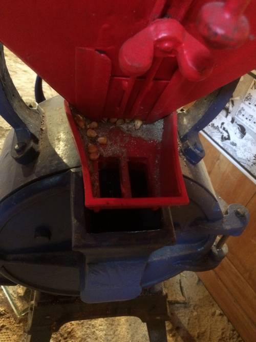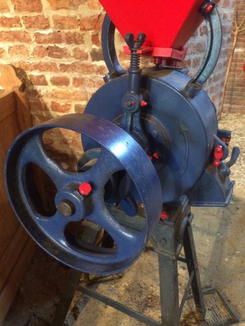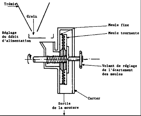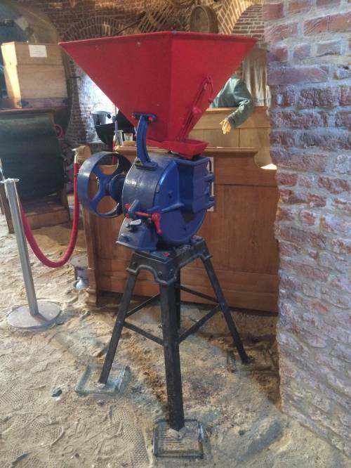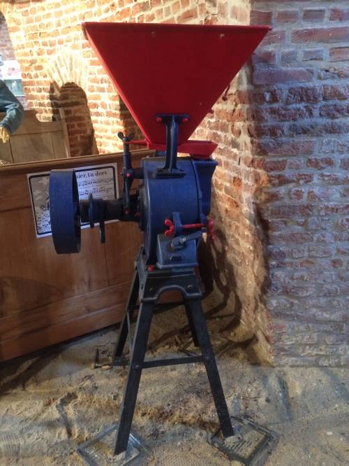 Le grain passe par plusieurs étapes avant de se transformer : il est d'abord déposé dans le récipient rouge, que l'on appelle la trémie. Il passe ensuite par une petite plaque de fer, située directement en dessous de la trémie, et qui se nomme l'auget. Il est ensuite deversé dans le mécanisme où il sera broyé par les meules circulaires (dont une est fixe et l'autre rotative) et ressortira par le petit canal. La roue est présente soit pour actionner le mécanisme soit pour régler la distance des deux meules entre elles.