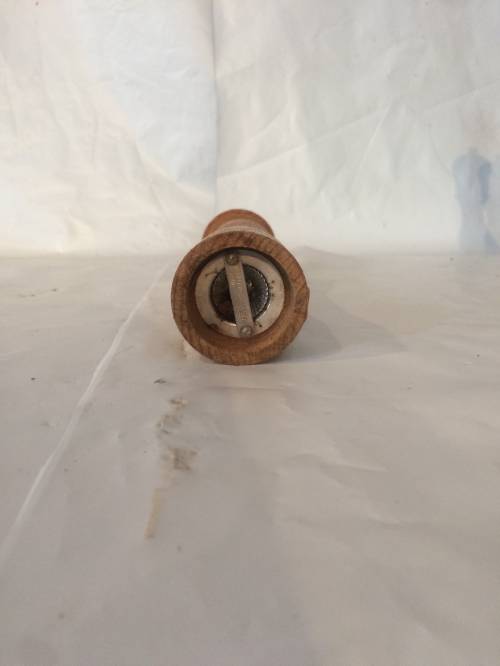 L'interieur de l'objet est totalement creusé de manière à pouvoir intégrer les grains de poivre. Le dessous comporte un système permettant faire ressortir le poivre qui a été moulu, ce système est fait en métal.